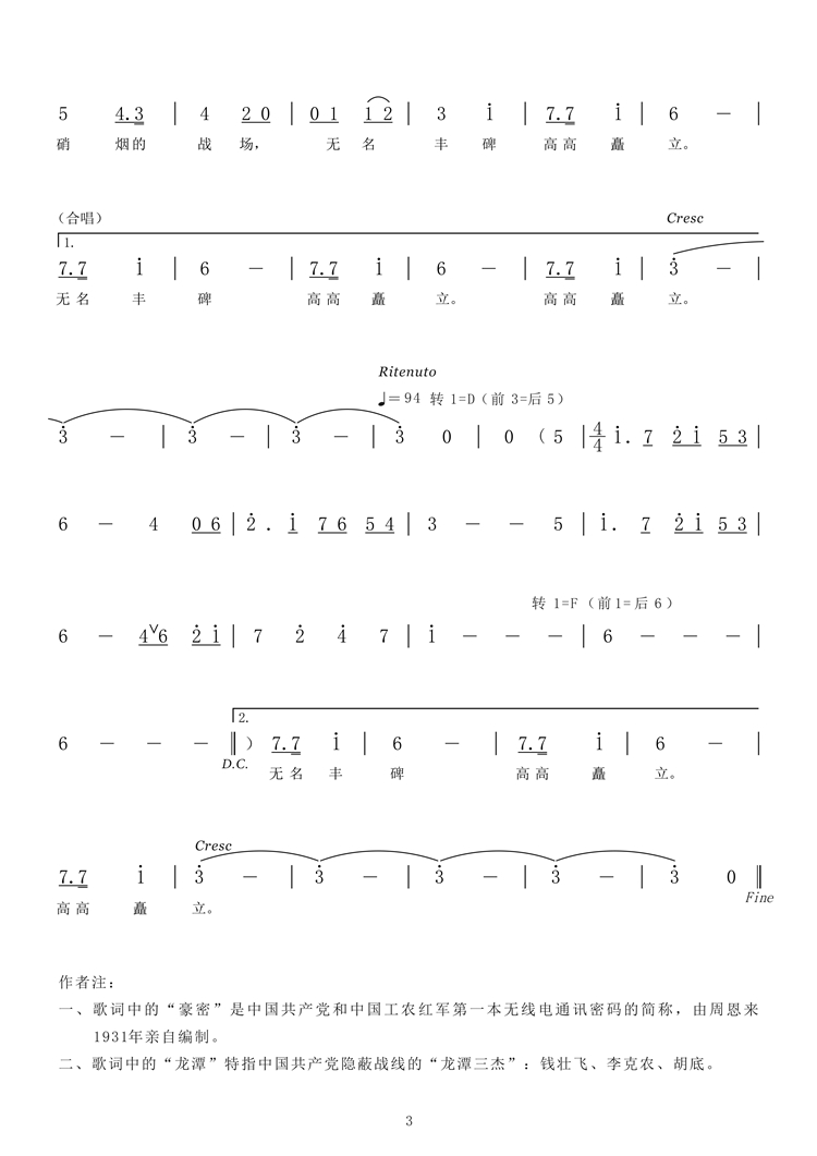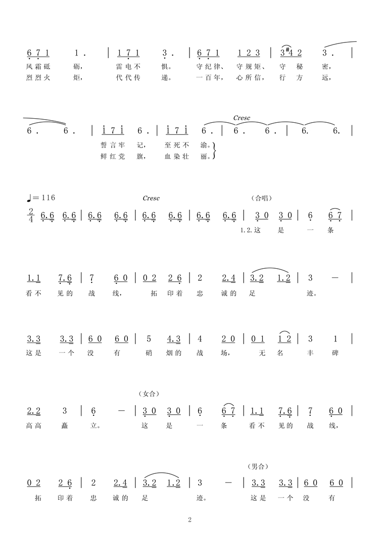 庆祝建党百年获奖歌曲作品选集——《没有硝烟的战场》歌词。 建党一百周年献礼歌曲 没 有 硝 烟 的 战 场 ——为 隐 蔽 战 线 的 英 雄 作 (入党誓词)我志愿加入中国共产党,拥护党的纲领,遵守党的章程,履行党员义务,执行党的决定,严守党的纪律,保守党的秘密,对党忠诚,积极工作,为共产主义奋斗终身,随时准备为党和人民牺牲一切,永不叛党。 (A1 段) 代号、隐语、“豪密” 一段历史风风雨雨 黑夜里的战士 直面生与死的命题 (A2 段) 龙潭、虎穴、谍影 一条险路折折曲曲 铁幕下的英雄 历经血与火的洗礼 (A3 段) 密钥、代码、暗语 网际风云伏伏起起 世界不是虚拟 人在密在时刻警惕 (A4 段) 秘密、机密、绝密 国家安全点点滴滴 我们捍卫和平正义 初心使命心中铭记 (B1 段) 一群人、一辈子、一条心 风霜砥砺,雷电不惧 守纪律、守规矩、守秘密 誓言牢记,至死不渝 (B2 段) 分党忧、尽国责、谋民利 烈烈火炬,代代传递 一百年,心所信,行方远 鲜红党旗,血染壮丽 (C 段) 这是一条看不见的战线 拓印着忠诚的足迹 这是一个没有硝烟的战场 无名丰碑高高矗立 这是一条看不见的战线 拓印着忠诚的足迹 这是一个没有硝烟的战场 无名丰碑高高矗立 无名丰碑高高矗立 高高矗立 作 者:万 飞 初稿于2021年2月24日 子夜 二稿于2021年3月8日 子夜 作者注: 一、A1段歌词中的“豪密”是中国共产党和中国工农红军第一本无线电通讯密码的简称,由周恩来1931年亲自编制。 二、A2段歌词中的“龙潭”特指中国共产党隐蔽战线的“龙潭三杰”:钱壮飞、李克农、胡底。 三、歌曲演唱顺序: 前奏(入党誓词念白)—A1段—A2段—B1段—C段—重复C段 间奏(入党誓词念白)—A3段—A4段—B2段—C段—重复C段 编辑:高思佳相关推荐: |