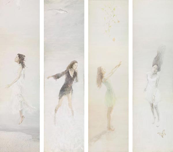 何多苓,《风水光气》,布面油画,300x80cm(每幅),2013 澎湃新闻:你80年代的作品相对比较写实,带着山的气息,而后可以明晰看到您创作的表达由实到虚, 这种变化源于何种影响,文学,还是传统中国绘画? 何多苓:其实都有。我的画里充满了文学性,这可能跟我爱好文学有关。我画面中的文学性不是一种叙事性,而是一种诗歌性。里边内涵了一些未知的语言,但是它又不能用详细的文字准确地描述出来。从《春风已经苏醒》我的画就有这么一种呈现。当然,那个时候我的画就受了美国画家怀斯的影响,这导致了我画得非常细密而且结实,几乎用尽了我的学院派技巧。 到1990年代以后,我想吸取一些中国画的表现方法。当时感兴趣的是宋画,我就把它的肌理、色彩感觉——不是它本身的色彩,是这么多年时间沉淀下来的色彩的感觉——用到我的油画上,抛弃了过去学怀斯的那种很结实的画法,开始变的虚一点了。后来就变得越来越虚,当然我觉得这个也和年龄有关,年龄越大,你生命中一些本质的东西会出来。这跟我处事的方法和性格都有些关系,“飘渺”也造就了是我美学上的一种趣味。 80年代的那些画在我看来很有趣味的,它们是一种极为偶然的怀斯画法。90年代初认识了一个中国台湾的朋友,他收藏了一些古画,我看了后很震撼,包括当时看了范宽、高克恭、郭熙,其中还感受到表皮之下,时间留在绢上的痕迹,就把它运用到我的油画中,成为我画面肌理的一部分。 再者,我运用的是一些中国文化符号。比如,我最初画《迷楼》借鉴了老虎、豹子、水獭等小动物的象征性符号,有点拼贴式的效果。还有就是线,这是另一个因素也是很偶然的,那会儿我开始对建筑感兴趣,所以我用了一些抽象的建筑符号,我当时对画中国的庭院的画很感兴趣,当时有一本《金瓶梅》的插图集,里面全是用工笔画的中式庭院,我觉得重叠非常复杂,层层套起来,而且他用中国式的散点透视去画,非常有趣,我就把这个符号引进去了,其中也包括了一些线条的画法。但这对我说不是一个本质的东西,是一个过渡。因为第一我不太喜欢拼贴的画,第二画直线也是我觉得很累的一件事情。后来到2000年以后结合了种种,比如把80年代的人物加背景的模式又用到画面上,但背景变了,不再是山,而是像水、光和气的组合体,包括植物等很很虚的东西。而且也引入了中国画文人画写意的这样一种元素。尤其是《杂花》写生,就是对我的花园里的我的一些花的写生,这些在大家看来好像跟传统中国画的距离比跟油画更近一些。
