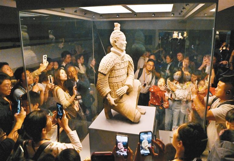 国庆假期,秦始皇帝陵博物院吸引众多游客参观游览。 通讯员张天柱 首席记者李明 摄 文旅产品多样化 感受中华优秀传统文化独特魅力 国庆假期,西安博物院推出的“探长安——西安市文物保护考古研究院30年考古成果展”,采用了考古模型、数字交互、互动体验等多种方式,让遗址场景更生动地呈现,不仅展示了考古工作的新理念、新技术、新成就以及科学研究和文物保护取得的成果,为国庆假期增添了浓浓的文化氛围,增进了观众对西安考古人的了解。 与此同时,非遗民俗也“拉满”了游客体验感。2024西安市“非遗·秦岭”文化主题活动,推出20余项非遗项目大集和展演,发布6条非遗特色线路,“可看、可玩、可品尝、可体验”的非遗项目让市民游客畅享中华优秀传统文化的独特魅力。 9月28日至10月13日,陕西省庆祝中华人民共和国成立七十五周年美术作品展览,同时在陕西美术馆、陕西省美术博物馆、亮宝楼艺术博物馆、西安浐灞丝路国际文化艺术中心美术馆4个展馆展出,通过对时代风貌的描绘和对社会新貌的捕捉,反映出陕西美术工作者“脚踏坚实大地,植根生活沃土”的自觉担当。 文博景区备受青睐,西安市各博物馆策划推出80余项主题展览和文博体验活动,接待游客211.29万人次,较2023年增长10.95%。其中,秦始皇帝陵博物院、陕西历史博物馆、钟鼓楼等景区假日接待连续达到最大承载量。 同时,我市持续加大西咸新区、浐灞国际港等非热点片区宣传推介力度,充分发挥引流分流作用。西咸新区持续走热,茯茶镇景区接待游客同比增长106.35%,乐华城景区接待游客同比增长727.87%,丝路欢乐世界接待游客同比增长183%;浐灞国际港片区接待游客同比增长16.72%。 另外,为了应对大客流,许多景区采取分时预约、延长开馆时间、增设停车位等措施,虽持续高位运营,但秩序井然。