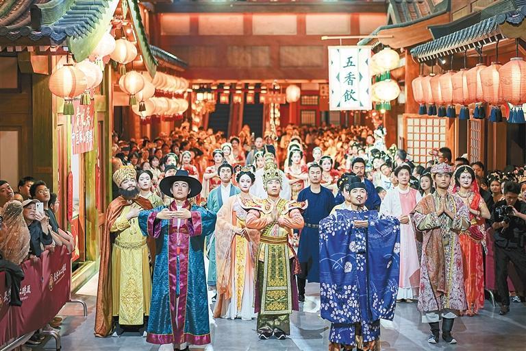 10月2日,演员在长安十二时辰主题街区表演。 新华社发 带动效应凸显 19台精品旅游演艺演出1104场次 因为一场演出,爱上一座城。今年国庆假期,北京游客刘轩在西安一连看了4台演出,让他体会到“演艺之城”的魅力。“我忘不了秦俑在舞台上‘复活’的那一刻,我也为唐玄宗与杨贵妃的爱情故事感动,更忘不了丝绸之路的奇幻瑰丽,我仿佛听到了历史的回响,感受到了西安文化的厚重与深邃。”刘轩说,西安的精品演艺如同一本生动的历史书,每一个细节都让他震撼。 从周礼诗韵到泱泱大秦,再至强汉盛唐,西安的19台旅游演艺涵盖了13朝古都的历史,彰显中华民族的文化自信,成为打造“一带一路”国际文化旅游中心、拉动西安文旅高质量发展的有力支撑。 舞台上面能划船,观众头顶会下雨,三千吨黄河水从天而降,数百立方米黄沙扑面而来……今年国庆假期,《西安千古情》10月3日至4日连续两天日演出17场,不仅创下演出纪录,还用虚实结合的表现手法打破舞台与观众区域的界限,让观众沉浸式地感受西安史诗巨变。 国庆前夕刚刚上演的超大型秦文化主题演艺《赳赳大秦》,在国庆期间一连演出13场,创新演绎中国秦文化传奇故事,完整自信地表达出秦人百折不挠、锐意进取的地域性格,成为了解大秦帝国的历史窗口。 据了解,国庆期间19台精品旅游演艺共演出1104场次,同比增长135%。《长恨歌》《长安十二时辰》《驼铃传奇》《西安千古情》《复活的军团》连续多日满负荷运营,《唐朝诡事录·西行》等XR沉浸剧场深受“00后”等年轻观众欢迎,旅游演艺的带动效应日益凸显。 此外,火爆的旅游演艺市场还带动了唐装汉服和妆造、文创产品、餐饮住宿等行业的蓬勃发展,成为丰富景区景点业态、延长文娱演艺产业链的重要抓手。 弘扬文明新风尚 用暖心服务托起游客的“诗和远方” “到了西安就跟到自己家一样。”国庆节期间,两位青岛游客在大雁塔被志愿者“硬塞”肉夹馍的视频走红网络,网友们点赞的同时,也为西安善举微光所感动。 自发给游客送肉夹馍的爱心市民志愿者叫蔡淑蓉,今年55岁,是西安慈善红枣志愿者服务队的队长。10月1日当天,考虑到大雁塔北广场附近吃早餐不方便,蔡淑蓉和志愿者们准备了200个馍和20瓶辣牛肉酱,给全国各地游客免费发放肉夹馍, 当天除了两位青岛游客,还有来自内蒙古、天津、甘肃等地的游客也吃到了爱心早餐。 节日期间,西安随处可见车让人、让景于客以及志愿者服务,不断弘扬的文明新风尚,让西安城市文明铺就鲜明的文化底色。 大唐不夜城、秦始皇帝陵博物院、南门城墙、北院门钟鼓楼等热点片区,采取延长开放时间、增加安保力量、实行交通管制等措施,重点区域安全平稳、秩序井然;西安各大景区则通过网上预约、加强疏导,用周到的服务确保游客获得舒适的游玩体验,通过好状态、好服务,用暖心、贴心和用心的服务,托举起广大游客的“诗和远方”。 从早到晚,在拥挤的人流和车流中,来自西安一线交警、城管、消防员、讲解员等身影总是“逆流而上”。遇到外地游客求助咨询,他们总是尽最大耐心答疑解惑;遇到游客生病等突发状况,他们会开辟绿色通道将其送到医院;他们每天要走3万多步,只为带给市民游客平安祥和的节日环境。据了解,在大唐不夜城、北院门钟鼓楼等热点景区的青年志愿者有3000余人,及时为游客提供“就在身边”的服务;曲江新区、雁塔区则引导企业开展汉服寄递服务;莲湖区携手顺丰、中国邮政等企业,将星级饭店、A级景区、游客服务中心等纳入汉服租赁退还服务点,实现1小时内全城配送,受到游客好评……节日期间,全市旅游市场环境安全有序,游客的获得感、满意度不断提升。(西安日报 记者 杨明 ) 编辑:图图上一篇:国庆假期 陕西省接待国内游客4601.46万人次