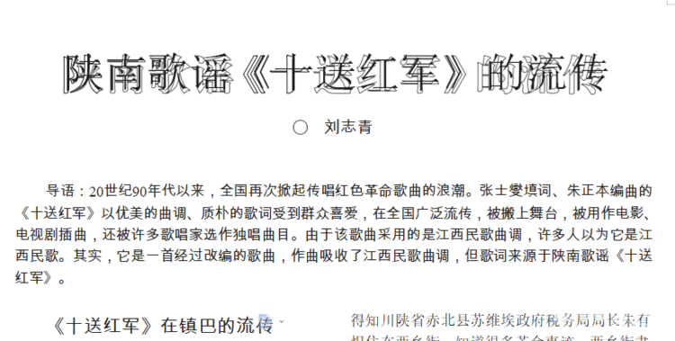 刘志青教授是汉中南郑人,现在是中国人民解放军军事科学院研究员、研究生导师。多年来,他潜心研究中外军事历史和我国红色文化,走访各地,考察史迹,四处讲学,出版专著。 刘志青教授对汉中的红色文化格外关注。今年走访了南郑、镇巴等革命根据地,对陕南红色交通线、巴山游击队革命斗争历史做了细致了解,带领中央电视台专题组到汉中市南郑、镇巴等区县采访录制专题片。同时,他查阅了大量上世纪五、六十年代的报刊资料,对红色歌谣《十送红军》的收集整理发表过程和首创作者及作品流传等情况根由做了深入挖掘和梳理。其结论是《十送红军》歌词是陕南歌谣,最早收集整理发表这首歌谣的人是汉中的孙伯和先生等。孙伯和从上世纪五十年代就开始搜集整理陕南革命歌谣,后称“红色歌谣”。上世纪50、60年代孙伯和先生在报刊上发表了几百首红色歌谣,确立了孙伯和是陕南红色歌谣的最早收集者、整理者、发表者、传播者的地位。 刘志青教授在2019年第8期《炎黄春秋》期刊上发表长篇报道文章《陕南歌谣《十送红军》的流传》,对《十送红军》歌谣的出现过程就流传情况作了全面介绍,廓清了《十送红军》歌谣的有关疑难问题。下边节录几段请大家阅读研究。