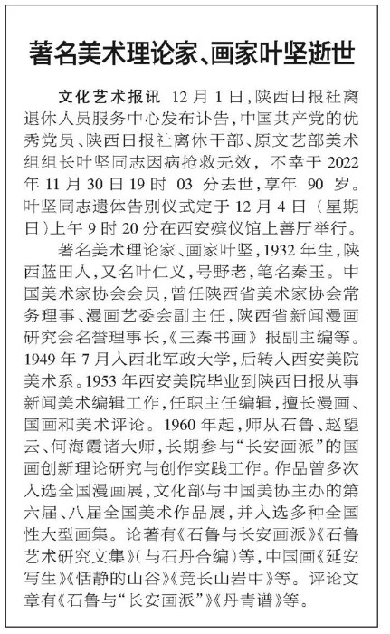 长安画派见证者、著名评论家叶坚去世 来源:文化艺术网-文化艺术报 作者:徐华 时间:2022-12-01
