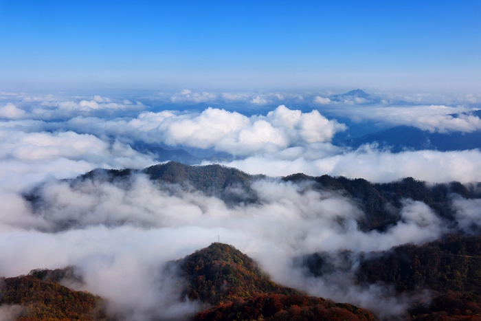 远山云海,举步皆景。此时的南宫山,是观赏秋色的最佳时节,空气最明净清透,一尘不染,远处,蓝天、白云、群山交相辉映。在深蓝色的天空映衬下,缓慢流动的云雾填满山谷,环绕着山峰,呈现出一幅美丽画卷。既有北方名山之雄奇,又有陕南巴山之柔美,是一处集奇、险、峻、秀于一身的独特的自然景观。