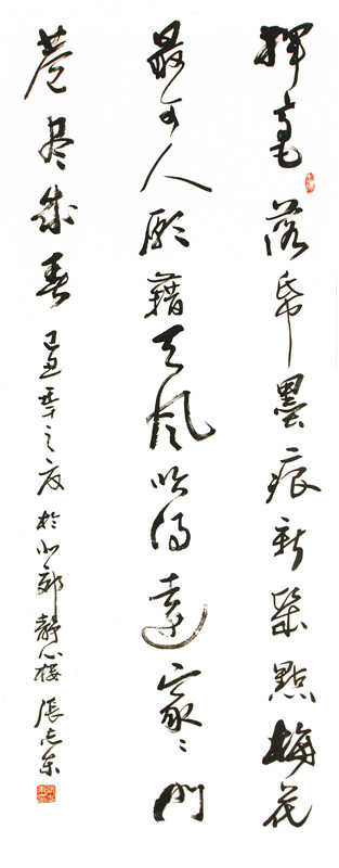 古有云:“入之愈深,其境愈奇。”当今书坛,浙人写行草,柔美而线条轻滑;川人写行草,厚实而结体丑陋。我以为,对传统挖掘的深度直接决定作品的高度,在方与圆、曲与直、浓与淡、缓与急的变幻中,追随古人的黑白交响,描画自己的艺术心路。书法不是技术的产物,它是以线条、结构、章法为载体,倾注了无比丰富的人文情怀……诸如书写者的品格、审美追求、人生理想、世界观等等。所以,书法是哲学的、音乐的、也是文化的。