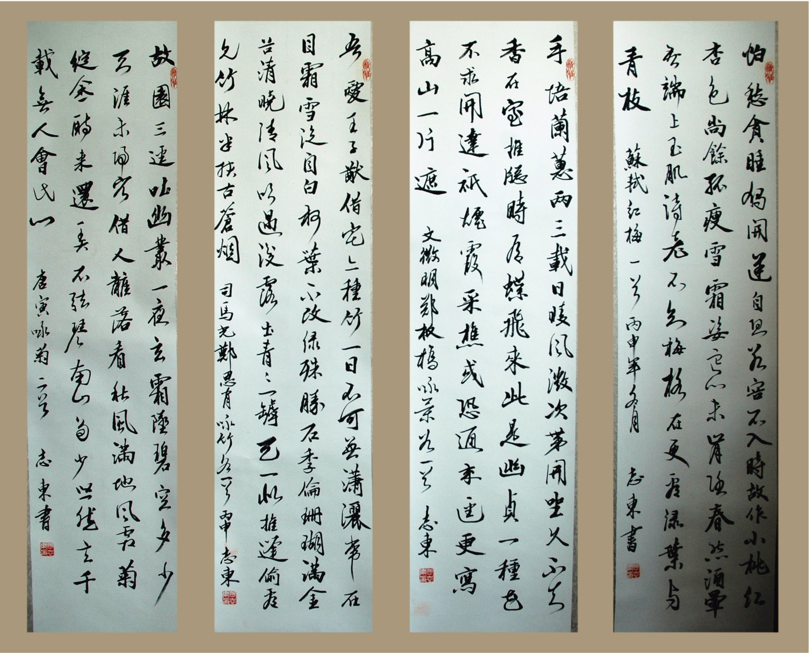 书法家简介 张志东,陕西杏林书画协会常务理事,陕西于右任书画研究会会员,西安市书法家协会会员。书法作品多次入选省、市书法展览并获奖。在《中国书法》《书法报》等报刊发表书法文论数篇。 与书法结缘,是我此生最大的快慰。三十多年来,每天必于喧嚣中为自己辟留一段寂寂之时,潜心书斋,心鹜八极,徜徉于碑林墨海,探寻先贤笔致的意趣。尤在夜阑人静之时,更是我如痴如醉的最美时刻。书法,是我一生最美的遇见。