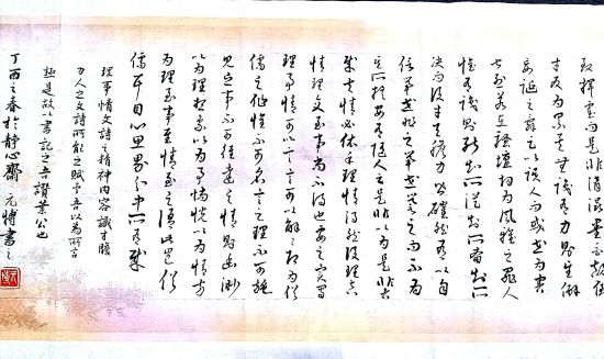 洒脱,是李元博书法的又一个突出特点。洒脱不是那种不负责任没有规矩的随意妄为和强颜作态的做作,而是一种责无旁贷、尽其所能的责任担当和理直气壮的自由表达,是一种心底踏实放飞心情的义无反顾,是一种心无挂碍的自由活脱,不求扬名于当世,但求无愧于我心。这种洒脱在他的草书作品中表现得尤为充分。其中章法的不落俗套、用墨的浓枯对比、布局的大小错落、遣字的行草相兼、行笔的自然有致、稳实沉着而又毫不迟疑的潇洒,彰显出放縱翰墨,飞笔纸上,遊于方外,精神十足的自由挥洒气象。 元博先生是一位严肃的书法美学理论学者,同时又是一位功力深厚、特点显明的书法艺术家。他给沉寂的书法理论一泓静水投入了理论之石,溅起阵阵浪花;他给多姿多彩的书法艺术园地送去阵阵馨香,点缀了一片锦绣。我们期待他沿着自己已经走出的书法理论与实践结合的道路继续前行,打造出属于现代人、同时又属于历史和未来的艺术与理论新天地。 编辑:张倩瑜 |