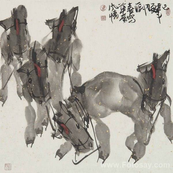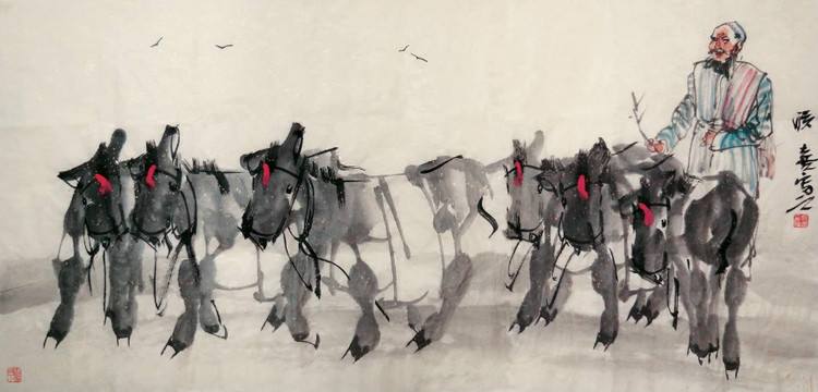 陈联喜画驴是狠下过工夫的,他是沿着黄胄创造性的一路走来的,最直接地继承了黄胄画驴的笔墨激情性,审美的现代性与结构的开放性,下笔果断,施墨润泽,墨中见笔,笔中透线,笔墨交融相映成趣而又各自分明,显示出有骨有肉的笔情墨趣,驴的形象或聚或散,或藏或露,或健步前行,或顾盼传情,整幅画作在经意与不经意间一气呵成,尽显驴的神韵与精神,其笔痕墨迹之美,意象氤氲之美,呈现出特有的个性,看来,他在画坛上享有“画驴妙手”的美誉名副其实,恰如其分。