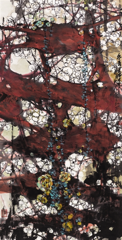 藤舞林深中(中国画) 柯桐枝 我和柯桐枝先生祖籍属闽,而隶籍于湘。虽交往时间不长,但我俩心神熠熠相与俱同。先生是吾湘高人,吾湘艺彩之表率也。 在中国花鸟画家中,柯桐枝的画作往往璀璨夺目,有一种寻春问秋的极好情致、极佳色彩感觉。 中国画原本提倡以墨代色,大都崇尚大素大雅,与“锦绣纷华”的作品相去甚远。前不久,我在日本看到尾形光琳的《燕子花图》,有一种华丽灿烂之感。与柯桐枝画作相较,色彩感觉各有千秋。柯桐枝的色彩更自然,尾形光琳的色彩来自华贵的工坊,自有一种富贵气。 浏览柯桐枝的作品,不能不感到他那种来自伟大自然的光怪陆离的色相之恢弘绚丽。当年,有人开玩笑说他是“好色之徒”,他亦含笑收受,制印钤于画上,这是他以“色”为画之观念的一种崇尚表述。当然,是不是一有色彩就美了呢?也不见得。当今画坛,那种完全以“大素大雅”为宗的艺术已经渐渐少了,完全以梅兰竹菊、水墨山水为宗的艺术家确乎在悄悄地变化。有好些画家,意图在花鸟画这个门类撕开缺口,把绘画推向以色彩为尚的境界。他们的作品把物象本身的颜色铺排在画上。好的方面是和传统花鸟画拉开了距离,而且比较强烈。但这种过分强调物象本身的色,往往会落入民间绘画对各种自然花卉色彩的直接描摹,加上构图等因素,而形成画如花布的感觉,意境、层次、格调,却等而下之了。这是十分可惜的做法。 柯桐枝不同,他对黑、白,特别是现代画家钟爱的灰色情调,都研究得十分深入,这是他内心深处“禅的意境”使然。 柯桐枝的动人之作有很多。比如《可谓春光一片晴》《飘香季节》和《晴日》等作品,都是笔法恣纵,墨色却十分强烈,有空白,有灰色基调和浓情厚意,读之震人心魄。他的《敢问苍天问风雨》《三月岭上花如潮》诸作,从题到画,从形式到内容,都是力度极大的创新之作。柯桐枝在作画时的思想活动是热烈的。比如《春洒雨林》,画的右侧有色有墨,而又简极生神地一片模糊,在整幅画上形成强烈对比,使画幅充满灵动之气,和《晴日》一样,异曲而同工。 从柯桐枝《敢问苍天问风雨》这幅充满诗意的作品,可以看到传统文化脉络。《醉山花》更是一幅饶有文人气质的力作,以一种流动飘扬的笔触,表现出浓烈的诗意。由于这种飘移的感觉,“醉”意盎然而显。而在此画的左边,留有大片空白,这和《芳野雨林》的反方向留白,又是一种新的尝试。他所使用的飘移的笔意,在必要时,又戛然而止,使这种顿敛作用,有一种“导之则泉注,顿之则山安”的感觉,形成一种天风朗朗、大岳堂堂的排寡纵横之气。这种情致非长期历练是不可得的。 柯桐枝对传统体裁、传统意趣是很习惯的,并非只是横涂竖抹地将就。比如《荷塘月色》《映日》《风清月朗花生情》等多幅以荷为题的作品,虽然都是中国传统的荷花主题、荷花命意和荷花情趣,柯桐枝并不止于此,这些画的下方大多有摇曳的池水和受日光映射形成的斑驳光影,特别耐人琢磨、耐人寻味。 《万木霜天红烂漫》一画,柯桐枝利用中国宣纸和色墨渲晕效果,把深邃的秋意渲染得十分到位,连那三只雀鸟也画成迎风作舞的情态,酣畅之至。与《锦绣寒塘》《春来花舞容》立意差不多,简单的留白和红黑对比,形成了春秋两个季节清华郁勃和悲慨苍凉的深刻感受。其中特别要提及的是《锦绣寒塘》和《春潮》两幅作品,标志柯桐枝的艺术已达至成熟,应该说这两幅作品是所有画作中最著神采者。如果《醉山花》和《春华倩影》还有技艺的尝试在其中的话,那么《锦绣寒塘》《春潮》可以说是作者各方面成熟的极致。这些作品笔致狂放,意绪悠扬,应是可以窥见柯桐枝传统笔墨功力精深的重要作品。 《寒冬过后是春天》和《万木霜天红烂漫》在构思上约属相似,前者的树干纯用浓淡不同的墨色画成,后者的树干则纯用细笔勾描。然皆发于此,亦收于此。仔细品味这两件作品,又是各具深意的创制。前者是写花,后者是写叶,各有特点,写花写叶两件作品,尺度相同,结构也差不多,但技法意念如此不同,给读画者的感觉截然相异。春天和秋天,是如此迥异,柯桐枝对此是神乎其技的:春寒料峭,鸟是瑟缩地挤在一起的;秋气爽健,鸟是腾扑飞翔,两者各异其趣。辨情辨理之精,令人惊叹! 柯桐枝游踪遍南北,这对打破传统画境,有重要的意义。他对传统题材梅兰竹菊取用较少,然对云南雨林中的自然物象,描写得较多。写梅如上述的《寒冬过后是春天》和《风送春香阵阵来》,又皆不拘之于往昔作者对形的追求,皆有“似与不似”之奇趣。 柯桐枝不仅仅工于写形,同样也工于造意。《月下花容》《阳光下杜鹃更红》可以看出他对自然万物观察体味之精。后者更使人感到他对太阳抱有一种膜拜和推崇的热情。 序年齿,柯桐枝比我小13岁,我却感到他有一种过人的艺术热情,此之所以使我撰写本文时对他抱有由衷的敬意。我18岁自故乡外游,自岭南而雁北,自西漠而东海,自觉尚能体察各种自然形态和情致,然较之柯桐枝,仍深觉不妥之处尚多。由于长期在故乡之外生活,对家乡的同道疏于问道和求教。而自柯桐枝和几位青年画友如赵溅球等始,当力求和画友们相与结成一种艺术上同气相通共同追求艺术的趣好,臻于至尚而后可。幸吾乡同道不吝存以教我。余虽年届耄耋,还望诸位同道相互体察,极而后达。柯桐枝以为然否? (