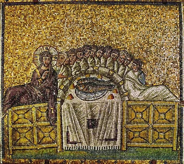《最后的晚餐》,拉文纳, 6世纪,拜占庭 表现这一神圣事迹的完整构图,最初见于6世纪意大利画家拉文纳绘制的拜占庭镶嵌画中。在拉文纳绘制的拜占庭镶嵌画中:使徒们沿着半圆形的桌子,排成半个圆圈,基督坐在一头,但他既非坐着也非站着,而是半躺靠着,左臂支着身体,右手空着。拉文纳的镶嵌画似乎很有现代风格,可它却是1500年前的作品呢。 达.芬奇:如何成为经典 《最后的晚餐》这么多人画过,为什么偏偏达.芬奇的版本成为经典?社会学者把这归结为来自达.芬奇的名人效益,基督信徒则愿意相信是达.芬奇的虔诚为画作带来力量。