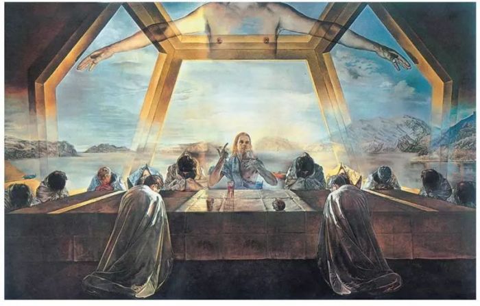《最后的晚餐》,达.芬奇,1485-1498,格雷契修道院食堂 使这个版本的《最后的晚餐》闻名的,绝不只在于作者本身的名望。仔细端详画面,可以发现靠近耶稣左右的使徒群组的动作幅度较小,而离耶稣较远的群组动作幅度要更大一些。这就如同往平静的池水中投下石头时,水面上泛起的波纹一般,离中心越近越小,越远则依次扩大。 耶稣预言背叛的话语正像投入池水的石头,冲击着每一位使徒,而画家描绘的正是这股冲击扩张的情形。换句话说,画家展现出了人眼不能看见的话语带来的震撼与强度,画出了耶稣具有冲击性的“话语的力量”。同时,达.芬奇创造出《最后的晚餐》最经典的图式,也在艺术的汪洋中激起波澜,成为后人竞相致敬、改编的对象。 达利:亲自把赝品卖给美术馆
