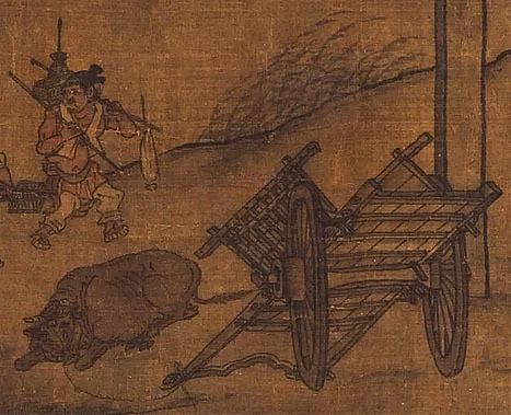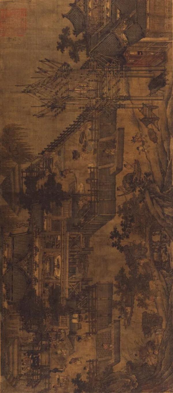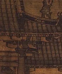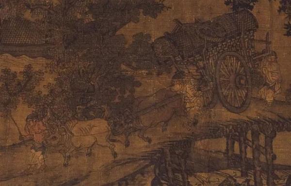 酒楼下属于画面右端前部的直棂窗,也是宋初流行的式样。酒楼前面的山棚,是我们在《清明上河图》中见到过的。《清明上河图》是宋迁临安后对旧都汴京的追忆。但《清明上河图》中的山棚,比起这卷《盘车图》的山棚来,是要繁复而有变化得多。这中间肯定有时间早晚的因素。