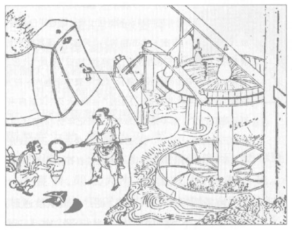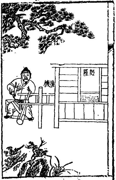 其次是安置在水磨旁边的“面罗”(筛面工具),王祯在《农书》中也提到,所谓:“水击面罗,随水磨用之,其机与水排俱同,按图视谱,当自考索,罗因水力,互击桩柱,筛面甚速,倍于人力。”但是按王祯的图像理解“面罗”的结构是有困难的。宋应星《天工开物》也谈到面罗,但他仅仅涉及“面罗”罗框的罗绢而已。同时,其文字的附图,也是用人力推拉的一般“面罗”,所以古代水击面罗究竟如何,就没有图像可以让人知道。