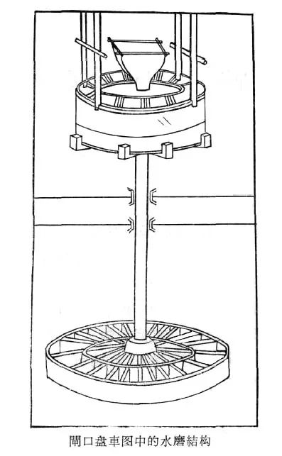 而《闸口盘车图》,却提供了至少是五代时期的面罗图像。根据这幅图像才可以相信确如王祯所说“其机与水排俱同”。但王祯的水排图,不知由于绘图疏忽,还是资料缺乏,以致有很多地方发生错误。而《闸口盘车图》虽然采用面罗的素材,然而究竟不是在画机械制作图,所以有很多部分无法从画面看到,即使如此,也仍旧不失为一幅真实的图像。从堂屋窗框中可以看见面罗上部的罗框和撞机构造;从下面栈架内,可以看见利用水力冲击卧轮的情况。中间部分由于楼板勾槛所蔽,无法看到它的机动部分的结构,但大体能够肯定它必然是与水排的构造相类似的。因此,也就可以据图推想其完整的结构。其机动功能的大致情况,和王祯所述的是基本相符的。