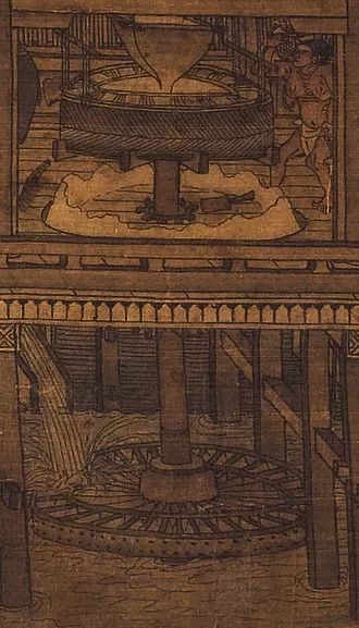 《闸口盘车图》卷所绘水磨、罗面机的装置构造精准写实,是目前发现最早也是最完整的机械图像资料。我国利用水力作动力的技术历史,约有一千九百多年。《后汉书》卷三十一《杜诗传》:“……(建武)七年(公元31年),迁南阳太守……造作水排,铸为农器,用力少,见功多,百姓便之。”到魏晋南北朝时,利用水排动力的水碓磨的制作,已经十分普遍。