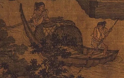 在这些繁复的物象间,作为衔接而组成画面有机整体的是四十五个人物的活动。其中占画面幅度最广、人数最多的是劳动着的“民夫”。他们有的在磨面、罗面,有的在扛粮,有的在扬簸,有的在净淘,有的在挑水,有的在引渡,有的在赶车,紧张地进行着各种不同的分工作业。