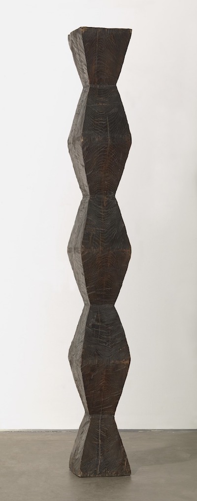 布朗库西,无尽之柱,版本1,雕塑,1918 这是现存最早的《无尽之柱》。在过去很多年,布朗库西都为此配上一或两个锥形底座,但最终他认为,抽象的柱形本身已凭借自身成为独立完整的作品。雕塑以橡木制成,连续的锥形体形成了富有波动感的几何形,象征着无限的延伸。一如其他重要主题,在此后一生,布朗库西都反复雕塑《无尽之柱》。1920年中期,他为摄影师朋友制作了一件,高度为23英尺(约7米)。 1937年,他在家乡罗马尼亚做了一件钢制《无尽之柱》,高度超过98英尺(约30米),直插空中。当时,作为《无尽之柱》系列中的最后一件,它与另两件大型雕塑《吻之门》、《无言之桌》,成为布朗库西留给公共空间雕塑的唯一一次合展。