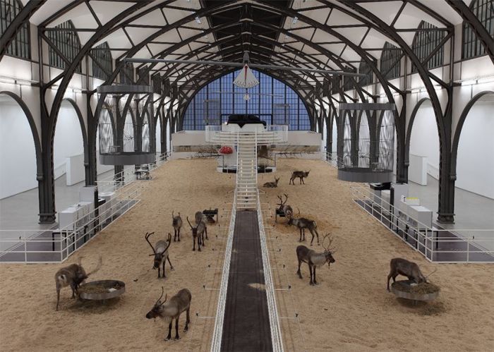 Gesangskanarienmobile (Singing Canaries Mobile) 2009 ”Divided Divided”, Museum Boijmans van Beuningen, Rotterdam, 2010 © Carsten Höller Courtesythe artist 在巨型滑梯和鸟类之外,千奇百怪的毒蘑菇、驯鹿也总是霍勒作品的常客。多年来,霍勒用大型装置、多媒体艺术和多物种并存的空间扰乱看客思维,以分割为法则不断挑战观众的惯性意识,因混乱而产生的迷惑性,则是霍勒每次“艺术实验”的目的。霍勒认为“被更改的精神状态能够加强我们对世界的理解”。2010年,在名为“苏摩”(SOMA)的展览中,霍勒将 12 头驯鹿分两组饲养在汉堡火车站美术馆,给一组驯鹿喂食毒蝇伞,并取它们的“致幻尿液”存放在现场供观众尝试。而在今年北京常青画廊的个展“方法论”现场,“苏摩”再次拓宽了表现形式,每个场景都由一只驯鹿、一名女模特和一朵新鲜的毒蝇伞菇构成,暗喻吠陀文学中提到的神秘物质。“苏摩”无论作为通往神界的道路或是精神启示的源头,都被吠陀人定义为神圣仪式的重要组成部分,在该系列作品中,艺术家表明了研究者和圣人之间的某种选择性联系。