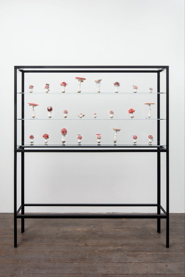 Double Mushroom Vitrine (Twenty - Fourfold) 2017 Cast polyurethane mushroom replicas, acrylic paint, glass discs, metalpins, vitrine glass, powder-coated metal framework 145 x 25 x 175 cm Courtesy the artist