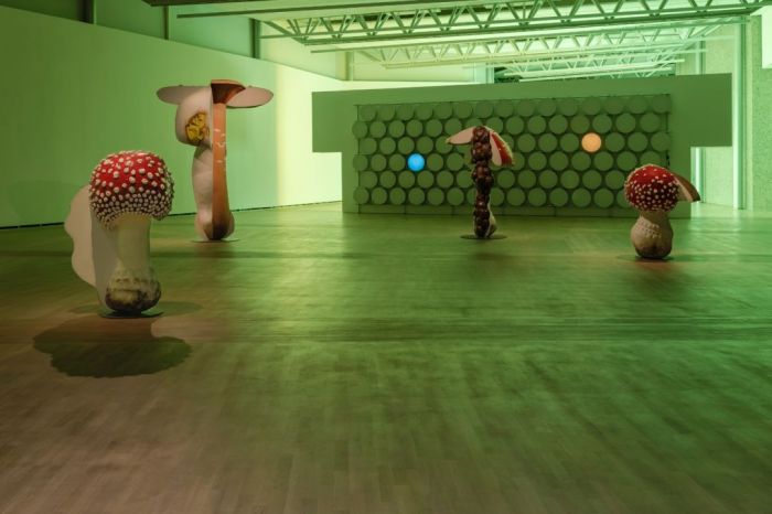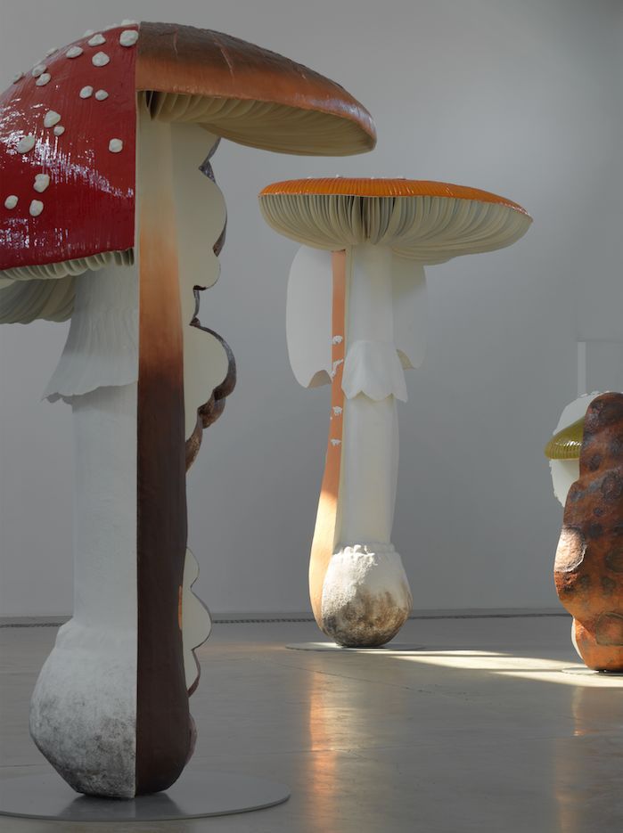 Giant Triple Mushroom 2017 Fly Agaric - Fliegenpilz - Amanita muscaria / Carbolic Champignon -Karbolegerling - Agaricus xanthodermus / Monk’s Head - Mönchskopf -Infundibulicybe geotropa Polyester mushroom replica; polyester paint, synthetic resin, acrylic paint,wire, putty, polyurethane, rigid foam, stainless steel Installation view at Henie Onstad Sanatorium, Henie OnstadKunstsenter, Høvikodden, 2017 © Attilo Maranzano
