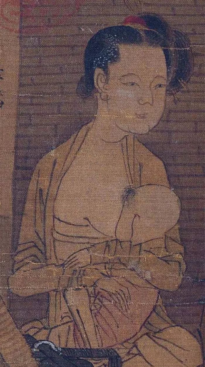 (宋《杂剧人物图》) 宋人佚名的《蕉荫击球图》(北京故宫博物院藏),画了一位年轻的母亲在庭院里陪孩子玩击球游戏,她身上穿的也是褙子。南宋画师李嵩绘有一幅《骷髅幻戏图》(北京故宫博物院藏),图中一位平民少妇正在哺乳,可以看出来,她的上装是一件低胸的抹胸,外面再套了一件敞开的褙子。