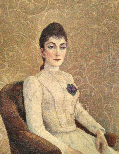 清华美展中展出的阿尔伯特·杜波依斯-皮勒的《穿白裙的女人》也是一幅点彩派作品。看两幅细部,都由色点组成,有的色艳,有的色弱,色弱的呈现含灰色,而色艳的色相决定色感倾向;色点之间都有补色对比,红绿、蓝橙、黄紫俱全,它们交替交织分布,并且补色双方总是一方色艳,一方色弱,色弱方有时灰得连色相都很难分辨。这幅作品反映了点彩派的基本特点。