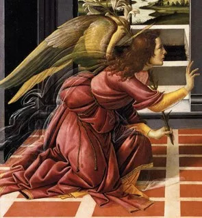 Botticelli /Cestello Annunciation, c.1489 波提切利(Botticelli)的《圣母领报(Cestello Annunciation)》 不同于安杰利科画中,天使站立在门廊内,圣母谦卑地半跪在木凳上,低垂着头。波提切利的天使,几乎是匍匐现身,单膝跪地,眉眼间显出谦卑而温柔的神情,仿佛不是来“告知”圣母受孕,而是来“祈求”圣母生下神的孩子的。