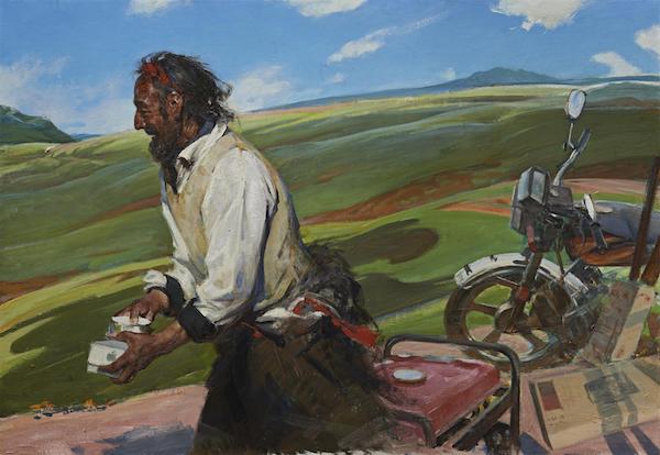 全山石《拉萨归来》布面油画,105cm×152cm,2011年 当我们在艺术领域引入和使用“语言”一词时,我们清楚地意识到,这只是从语言学的学科范畴里借用的一种象征性表述。虽然“图画”可以作为语言学家皮尔士所定义的一种“肖似记号”纳入非语言符号学,但艺术的象征价值恰恰在于其模糊性和意义的开放性,这是现代语言符号学难以规训的一种古老的意义表达方式。在今天,艺术这种非语言符号性的意义传达系统与科学的语言表达系统(如数学语言、物理语言)并存,一如马克思1857年在《<政治经济学批判>导言》中提出的人类掌握世界的四种思维方式,即“实践精神的、理论的、艺术的和宗教的”。艺术的思维方式借助于艺术语言的表达,彰显出其对现代人的现代生活所具有的特殊的人文精神价值,而油画语言则体现了油画艺术家的存在之思,意义之思。