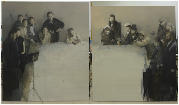 殷雄,《上海往事》,布面油画,200cmx175cmx2,2017年 第二部分、形色之力: 形笔如塑,油彩如虹。油画富于质感与温度的形色质料,跬成丰厚的艺术表现力,塑造着一部感心弘愿的文化史篇。 作者(9人):妥木斯,费正,邱瑞敏,王克举,金田,张新权,顾黎明,申玲,刘商英