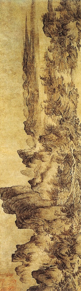 五代董源《寒林重汀图》局部 《寒林重汀图》是被董其昌定为五代时南唐画家董源的作品,描绘的是隆冬时节的江南景色。图中山丘静穆横卧,水汀幽深绵延,落尽叶片的树木无言挺立,纤纤芦苇瑟缩于风中,溪上小桥空寂清冷,掩映于荒丘寒树间的屋舍阒无声息,所有景象构成一个萧瑟凄清的无人之境。此图山坡以披麻从坡脚上皴,由密而疏,直至坡面方留空白。又于山坡起伏处加上苔点。图中皴笔以方折增强动势,粗阔劲健,苔点则兼用渴笔、焦墨、乱锋,运笔迅疾。力量劲猛,增强了画面的生动和逸趣。在堤岸画法上,作者以长披麻与碎笔乱点结合,为画面带来了节奏感和运动感。汀渚则用长披麻湿笔平拖,具有酣畅浑朴的特点。
