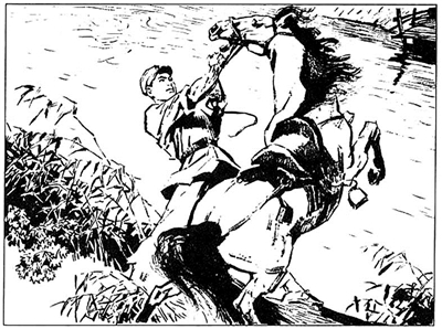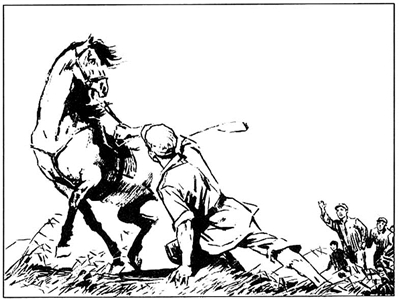 图9 星转斗移,多少年过去了,其中的不少画面仍然闭目能够望着,凝神亦复想见,一个重要缘故,想来还是因为画家独特的艺术语言在起作用。沈尧伊是版画科班出身,兼具深厚的西画功底,揆之常理,他似乎应该选择自己所擅长的表现方法。然而我们看到,《战马驰骋》既非版画亦非油画,而是中国连环画传统意义上的白描。不过,这种白描不是单纯的线描,而是将西画中的透视和黑、白、灰等调子引入其中,通过线条的粗细变化和大块黑白对比,重在表现对象的立体感和光影效果,以造成强烈的视觉冲击力(图10、11)。这方面,杨逸麟、董辰生、王怀琪、雷德祖等人,都是高手。然而仔细分辨,沈尧伊的画法似乎还是与这几位有所不同。他不仅使用了上述技法,而且也大量使用毛笔的中锋、侧锋、逆锋,不仅有块和线,且不乏勾、勒、皴、擦、点的笔韵,使画面层次更加丰富,技术含量更高,不仅有版画、油画的效果,也同时兼具国画的韵味(图1)。