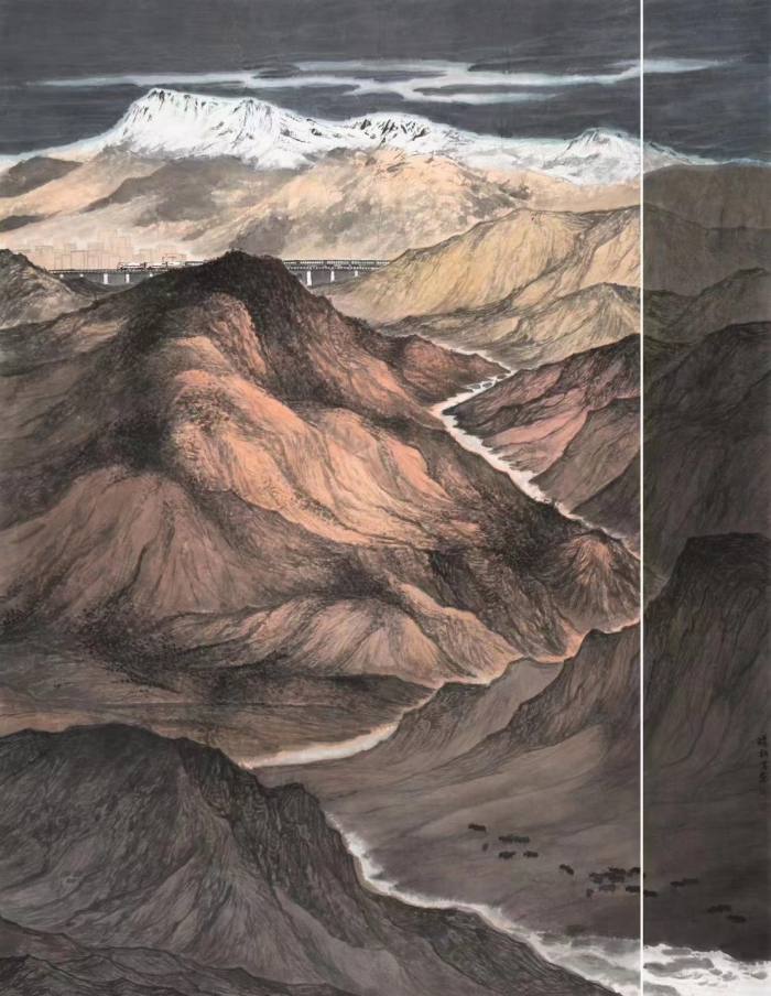 在甄比中,他选择了以黄宾虹、张仃为法师的,以为祖国山河立传为题材,以写中国精神的山水画,作为自己的创作道路。大学是他的知识扩充期。他疯狂地读康德,读尼采,也读巴尔扎克,读福楼拜,但最多的还是读美术理论。他读西方美术史,中国美学史,读朱光潜,读丰子恺。先后光丰子恺的书就读过六七种版本之多。他常把中西美术进行比较,他喜欢上了中国山水和黄宾虹。画论说:“山水是中国人情思中最为深厚的沉淀”,黄宾虹山水又是中国山水精神的集大成。他沉湎于黄宾虹那润含春雨干裂秋风氤氲的画图,因偏爱程、黄的焦墨,而喜欢上了后继者张仃。因张仃,又涉及到李可染“为祖国山河立传”的绘画理论。师自然,师黄宾虹、师张仃是他的艺术轨迹,也是我们破解他绘画师承脉络的钥匙。在新的时代如何继承黄张的山水精神,画出具有自我面貌“权式”新样,是我与他经常讨论的主要话题。应该说,他能在这条道上走得更远,因为,老天会眷顾那些天赋异禀而有抱负的人。 宾翁说:“学那家那法固然可以给我们许多启发,但那家那法,都有实际的自然作根据。古代画家往往写生他家的家乡山水,因而形成了他自己独到的风格和技巧。”正如宾翁所言,他主要的生活轨迹在西藏和陕西,他的山水作品也就自然形成了两个鲜明的地域特色。我把它称为雪域藏风系列和秦风系列。 两个系列,即雪域藏风系列和秦风系列。雪域藏风系列,这是具有民族地域特色具有禅佛神秘意境的创作系列。主要作品有:《雪域金秋》《雪域天路》《高原律动》《沃野羌塘》《雪域揽胜》《三江源》《玄与素》《喜马拉雅的风》等几百幅以写实为主的,为祖国山河立传的作品。这些作品,有些具有地域的独特性,有些是极富民族风情特色,有些具有史诗性质,所有这些作品,价值在于原创性、民族性和时代性,对于体现中华民族大团结和见证地域版图有着不可替代的价值。