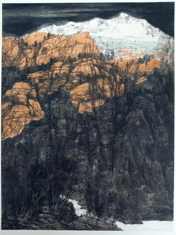 秦风系列。我把他的秦地作品称为秦风系列。秦岭是我国南北地理的分水岭 ,也是中华民族的精神象征 。为秦岭造境和立传,是他的心愿,也是他日夜劬劳的动力。为写秦山秦水,他坐公交,携杖出没于山林沟壑,出入于道观禅寺。跑得多了,他能清楚说出某偏远小县的某小饭馆与某小饭馆的羊肉泡馍放某种佐料还是没放,还能说出此山的险峻和彼山的逸漫。他行万里路,饮百部泉,创作了一系列《厚土情深》《秋风》《岁月静好》《黄土人家》《灯塔》《黄土情》《陕北高原》《漫道》《华山风骨》《岚皋烟岚》《一柱莲花撑天开》等有秦风秦韵并具有地域特色的大量画作。他跑了老辈长安画派画家未跑到的僻野,也画了老辈长安画家未画的幽境。