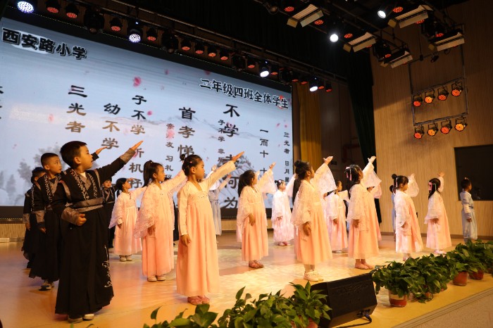 节目在少儿励志舞蹈《中华美少年》中拉开序幕。师生们身着节日盛装,欢快的音乐响起,绚丽的灯光亮起,孩子们尽情唱跳,释放童年的快乐。师生舞蹈、亲子朗诵、戏曲、音乐剧、情景剧等节目精彩纷呈、形式多样,充分展现了西安路小学近年来素质教育丰硕成果和新时代师生良好的精神风貌,弘扬了时代主旋律。