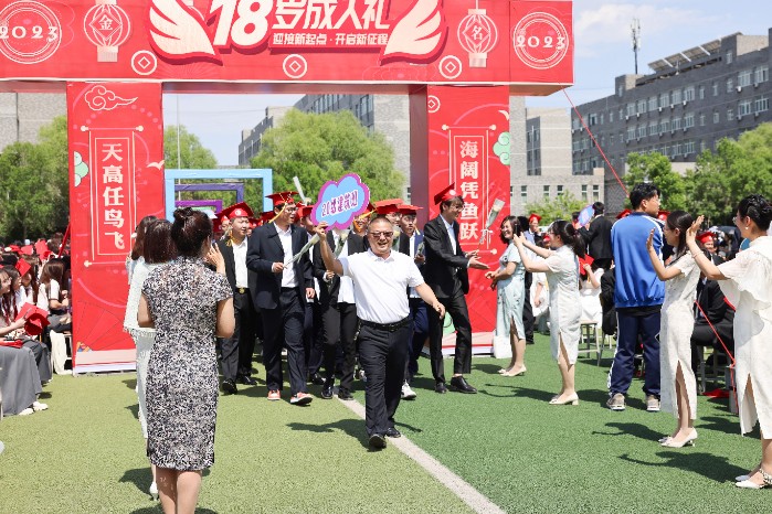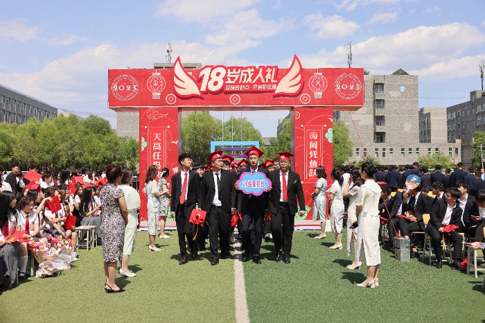 典礼的序曲在班主任为毕业生佩戴成人礼帽的过程中奏响,1600多名毕业生在各自班主任的引导下,师生的欢迎下,伴随着激昂的音乐,依次穿过彩门、成人拱门后进入指定位置就坐。