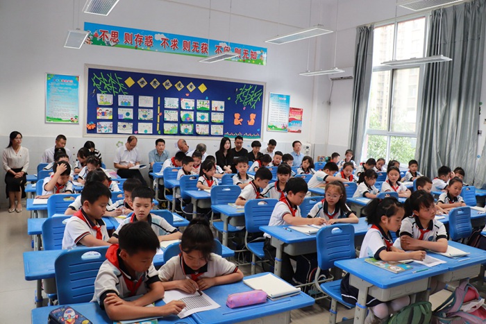 会议分现场参观、进班听课、分享交流、工作部署4个阶段进行。与会人员首先观摩了高新四小“第二课堂”“第三课堂”成果展示,随后,分语文、数学、英语、心理健康、道德与法治、科学、音乐七个组进班观摩“第一课堂”教学实况。