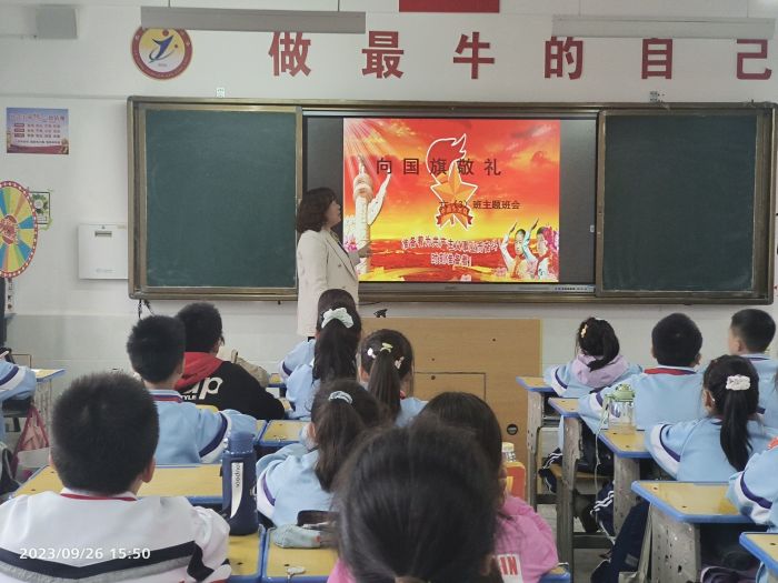 开展“唱响主旋律 筑梦新时代”歌咏比赛。学生用自己特有的方式表达对祖国的深情祝福和由衷赞美,唱出激情与梦想,唱出对伟大祖国的诚挚祝福。 开展主题班会。各班利用班会时间积极开展“我爱祖国”“祖国在我心中”“可爱的中国”主题班会。班主任讲解国旗、国庆节的含义和由来,讲述红色故事,进一步激发学生的爱国情怀。