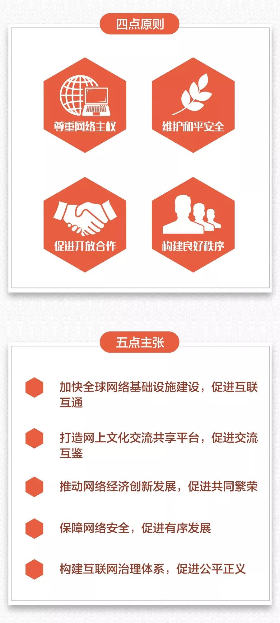 5、加强国际合作 习近平曾指出,互联网发展是无国界、无边界的,利用好、发展好、治理好互联网必须深化网络空间国际合作,携手构建网络空间命运共同体。要理直气壮维护我国网络空间主权,明确宣示我们的主张。为此,习近平提出“四点原则”和“五点主张”: