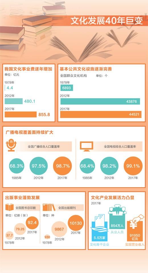 数据来源:国家统计局 制图:沈亦伶 “改革开放初期,那时候经常是多人共看一本书,电视里也只有很少的几部电视剧,文化生活可以说比较贫乏。”家住北京市朝阳区的李东阳出生于20世纪60年代初期,他深切感受到了改革开放40年以来文化生活发生的巨大变化,“现在的文化生活多丰富啊,图书、报刊、电影、电视、网络文化等目不暇接。为咱新时代点赞!” 改革开放40年来,各地区各部门坚持社会主义先进文化前进方向,深化文化体制改革,建立健全现代文化市场体系,构建完善公共文化服务体系,文化事业普惠民生,文化产业快速发展,文化强国建设稳步推进。特别是党的十八大以来,社会主义核心价值观建设扎实推进,文化创新创造活力被进一步激发,文化事业、文化产业蓬勃发展,人民群众的文化获得感和幸福感显著增强。2017年,全年全国文化事业费855.8亿元,比上年增长11.0%,党的十八大以来,全国文化事业费增速每年都超过10.0%。 40年来,广大群众深切感受到,身边的公共图书馆、文化馆、博物馆等公共文化设施的服务越来越丰富、越来越对味。尤其是党的十八大以来,标准化、均等化的现代公共文化服务体系日益完善,服务效能显著提升。目前,全国“三馆一站”公共文化服务设施全部免费开放,基本实现了“县有公共图书馆、文化馆,乡有综合文化站”的建设目标;广播电视村村通、文化信息资源共享、农家书屋等重大文化惠民工程深入实施,公共文化服务能力和普惠水平不断提高。 40年来,文化消费需求质量不断提高、数量不断增加。与此同时,我国文化市场主体、经营方式日趋多元,文化产业规模不断扩大。特别是党的十八大以来,文化与互联网、高科技融合发展,传统文化企业转型升级,质量和效益稳步提升。数据显示,2017年,全国共有文化骨干企业5.5万家,比2012年增长51.3%;从业人员为854万人,比2012年增长22.2%;实现营业收入91950亿元,比2012年增长63.4%。文化产业发展活力凸显,不仅满足了人们多样化的精神文化需求,更成为当前经济增长亮点之一,在推动经济发展、优化产业结构中发挥了重要作用。 伴随着改革开放的步伐,我国文化产品进出口连续多年保持顺差,与“一带一路”沿线国家的文化贸易取得积极进展,文化交流、文化贸易和文化投资并举的“文化走出去”新格局逐渐形成,中华文化影响力日益增强,国家文化软实力得到提升。党的十八大以来,中俄、中美、中欧、中阿、中非等文化交流合作机制向更高层次发展。“欢乐春节”等文化品牌活动影响遍及全球,树立了中国的形象和文化符号。中国文化年(节)等活动天天有、月月有、年年有,成为促进政府间文化交流与合作的常态化机制。 党的十九大报告指出,“没有高度的文化自信,没有文化的繁荣兴盛,就没有中华民族伟大复兴。要坚持中国特色社会主义文化发展道路,激发全民族文化创新创造活力,建设社会主义文化强国。”宣传思想系统工作者正以习近平新时代中国特色社会主义思想和党的十九大精神为指导,增强“四个意识”、坚定“四个自信”,自觉承担起举旗帜、聚民心、育新人、兴文化、展形象的使命任务。(郑海鸥) 编辑:文平 |