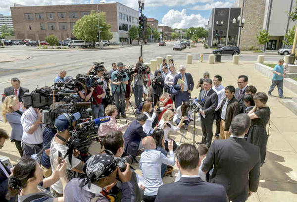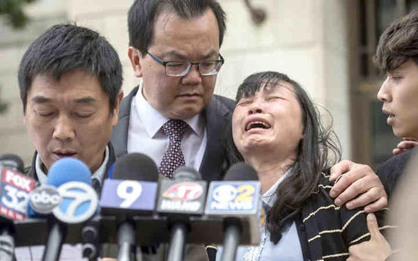 章莹颖家人参加记者发布会。WTTW News 图 家人相拥而泣:相信审判最终会带来正义 在宣告有罪裁定后,章莹颖的家人相拥而泣,在法庭外,父亲章荣高用呜咽的声音向等候多时的媒体朗读了一份中文声明: “我代表我们亲爱的女儿,我的妻子、儿子和我自己,感谢陪审团为伸张正义所作的第一步。我们感谢检察官、伊利诺伊大学的警官、FBI探员,和所有在本案的调查和庭审中提供帮助的人。我们感谢在中国、美国和世界各地帮助和支持我们的朋友们, 尤其感谢香槟和皮奥利亚华人协会和教会的朋友们为我们生活上提供的帮助。两年来,我们每天都想念着莹颖。直到今天,我们也无法想象如何在没有她的情况下度过余生,言语无法描述我们的痛苦和煎熬。我们希望并且相信审判最终会为莹颖和我们带来正义。我们的愿望永远都是找到莹颖,带她回家。我们不会放弃。” 据章莹颖家人的律师王志东向澎湃新闻(www.thepaper.cn)介绍,当天上午11点,控辩双方在发表完结案陈词后,法庭进行了休庭,法官宣布由12人组成的陪审团进行闭门讨论,两个小时后重新开庭,陪审团宣布嫌犯有罪,审判随即进入第二阶段,即量刑阶段,同一个陪审团接下来将决定克里斯滕森将被判处终身监禁或是死刑。