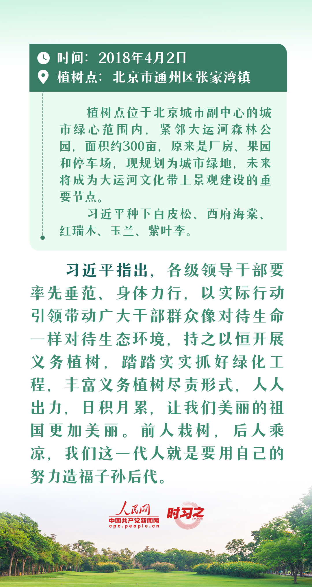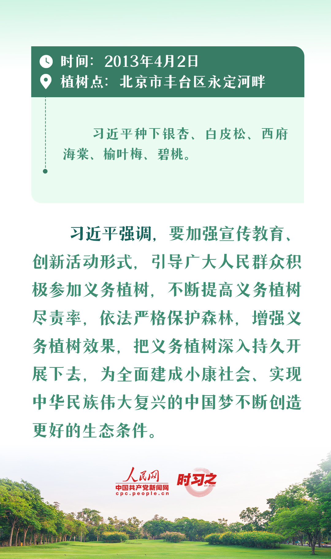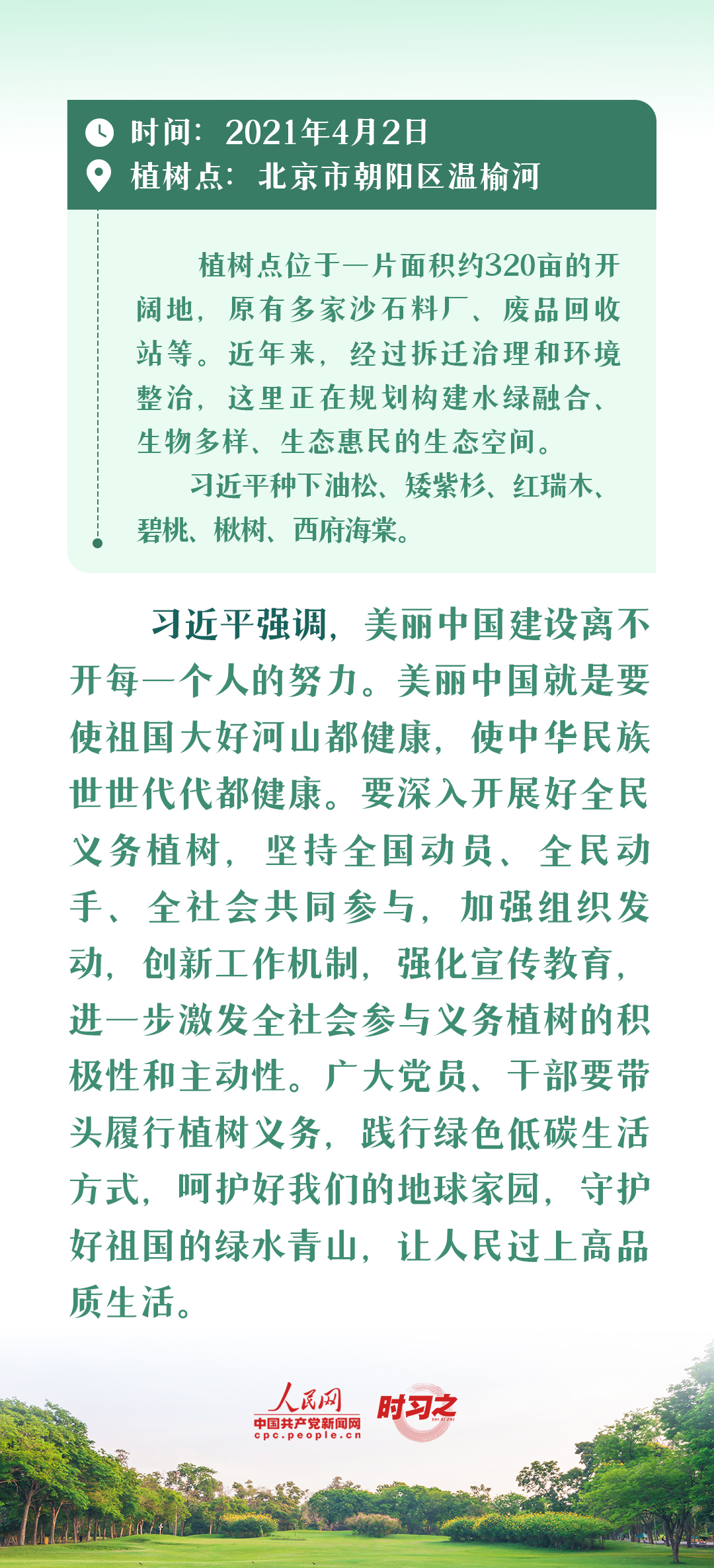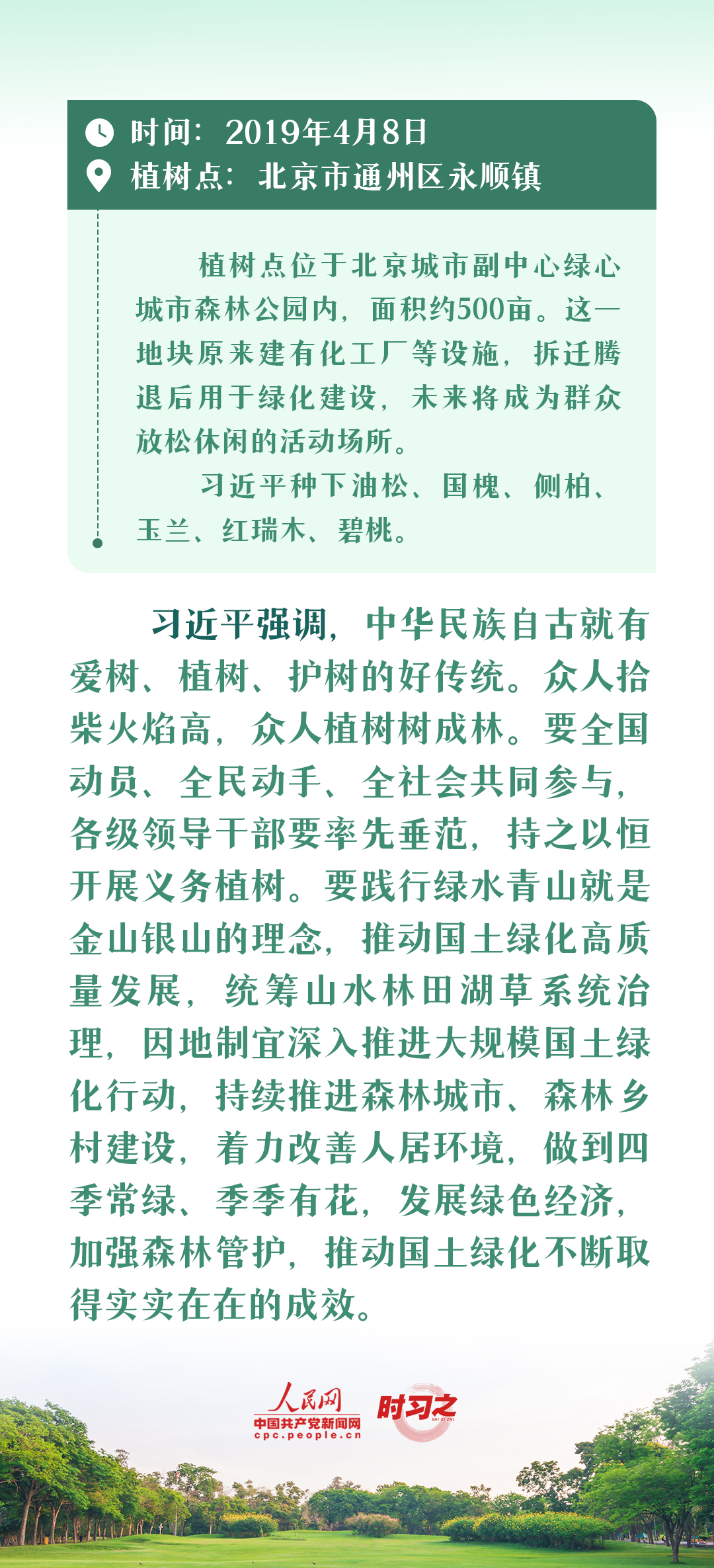 2023年4月4日,中共中央总书记、国家主席、中央军委主席习近平在参加首都义务植树活动时强调,人勤春来早,植绿正当时。 “植树造林是一件很有意义的事情,是一项功在当代、利在千秋的崇高事业,要一以贯之、持续做下去。”新时代以来,总书记年年履行与春天的“绿色约定”,身体力行,参加首都义务植树。