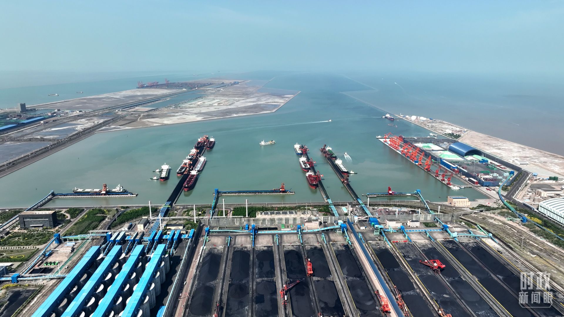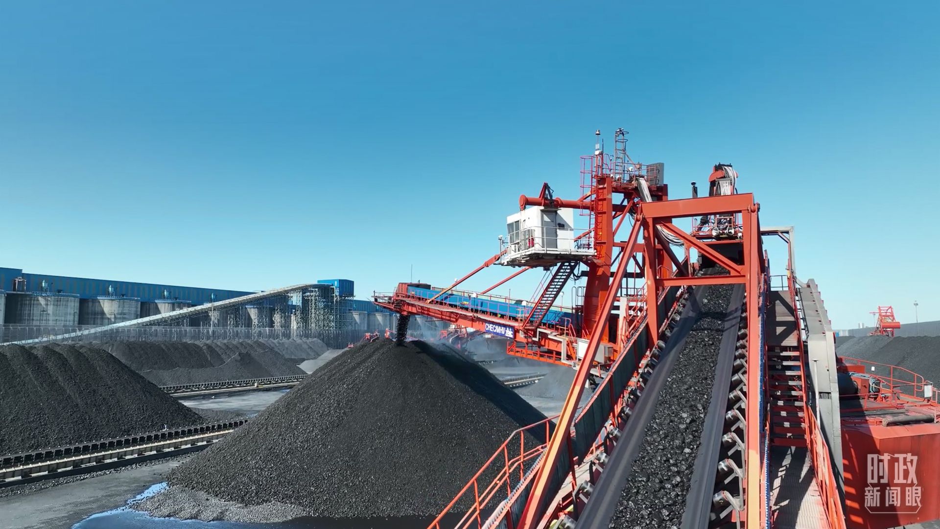 △黄骅港煤炭港区。(总台央视记者黎兵拍摄) 黄骅港是国内最大的煤炭下水港,拥有全国首个煤炭装卸全流程自动作业线。乌黑油亮的煤炭随着作业引导各归其位,成为一道独特的风景线。