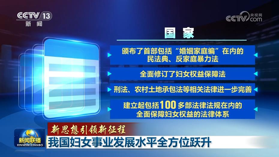 党的十八大以来,以习近平同志为核心的党中央把保障妇女合法权益、促进男女平等和妇女全面发展,作为中国式现代化的重要内容,对妇女事业发展作出一系列开创性、全局性、长远性的重大决策部署,坚持男女平等基本国策写入中国共产党施政纲领,促进妇女全面发展纳入国家发展规划,引领中国妇女事业取得历史性成就。广大妇女的获得感、幸福感、安全感前所未有,我国妇女发展水平全方位跃升。 新时代,保障妇女权益作为国家意志充分彰显,法治保障体系更加完善。国家颁布了首部包括“婚姻家庭编”在内的民法典、反家庭暴力法,全面修订了妇女权益保障法,刑法、农村土地承包法等相关法律进一步完善,建立起包括100多部法律法规在内的全面保障妇女权益的法律体系。