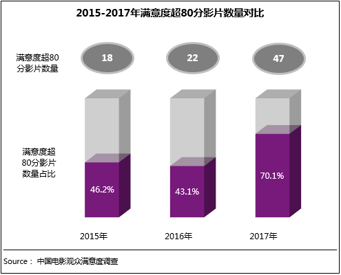 超七成影片进入“满意”区间,《战狼2》摘单片满意度桂冠 截止贺岁档,2017年满意度调查的重点国产片数量为67部,其中满意度高于80分的影片数量为47部,占比超70%;而2015、2016年满意度超80分的影片总数为40部,占比仅在40%左右。