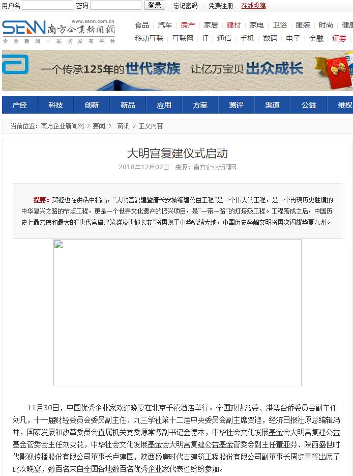 附录3:大明宫复建仪式启动 2018年12月02日 来源:南方企业新闻网 11月30日,中国优秀企业家欢迎晚宴在北京千禧酒店举行。全国政协常委、港澳台侨委员会副主任刘凡,十一届财经委员会委员副主任、九三学社第十二届中央委员会副主席贺铿,经济日报社原总编辑冯并,国家发展和改革委员会直属机关党委原常务副书记金德本,中华社会文化发展基金会大明宫复建公益基金管委会主任刘变花,中华社会文化发展基金会大明宫复建公益基金管委会副主任董亚芬、陕西盛世时代影视传播股份有限公司董事长卢建国,陕西盛唐时代古建筑工程股份有限公司副董事长周步青等出席了此次晚宴,数百名来自全国各地数百名优秀企业家代表也纷纷参加。 活动中,贺铿、金德本在讲话中指出如今众多优秀企业家在取得了辉煌成就之后,也不忘积极回馈社会,践行公益,其中大明宫复建暨长安城缩建公益工程就是代表之一。 大明宫与唐长安城是我国重要的文化符号,是中国唐朝的皇宫,是中国鼎盛期王朝的标志性建筑,在长达200余年的岁月中,大明宫是中国的政治、经济和文化中心。 (中华社会文化发展基金会大明宫复建公益基金管委会主任刘变花) (陕西盛唐时代古建筑工程股份有限公司副董事长周步青) 中华社会文化发展基金会大明宫复建公益基金管委会主任刘变花上台介绍了这一工程,她表示,大明宫复建暨唐长安城缩建公益工程基金由中华社会文化发展基金会发起设立。2016年5月17日,“大明宫复建公益基金”获中华社会文化发展基金会批复。2017年6月30日,“唐长安城缩建公益项目”获中华社会文化发展基金会批复。两大世纪建筑工程的批复将如并蒂芬芳的“姊妹花”和“子母工程”,在中华大地扬帆起航。 同时,贺铿也在讲话中指出,“大明宫复建暨唐长安城缩建公益工程”是一个伟大的工程,是一个再现历史胜境的中华复兴之路的节点工程,更是一个世界文化遗产的振兴项目,是“一带一路”的灯塔级工程。工程落成之后,中国历史上最宏伟和最大的“唐代宫殿建筑群及唐都长安”将再现于中华锦绣大地,中国历史巅峰文明将再次闪耀华夏九州。