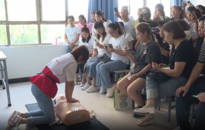 在保育一班教室,该县红十字会的应急救护培训讲师正在进行应急救护知识授课,从判断环境、体位摆放、检查呼吸脉搏与呼叫以及胸外心脏按压等方面,详细讲解心肺复苏的具体操作方法。除了示范教学外,每名学员还通过实际模拟演练,全面掌握按压的手法要领和应急救护方法。
