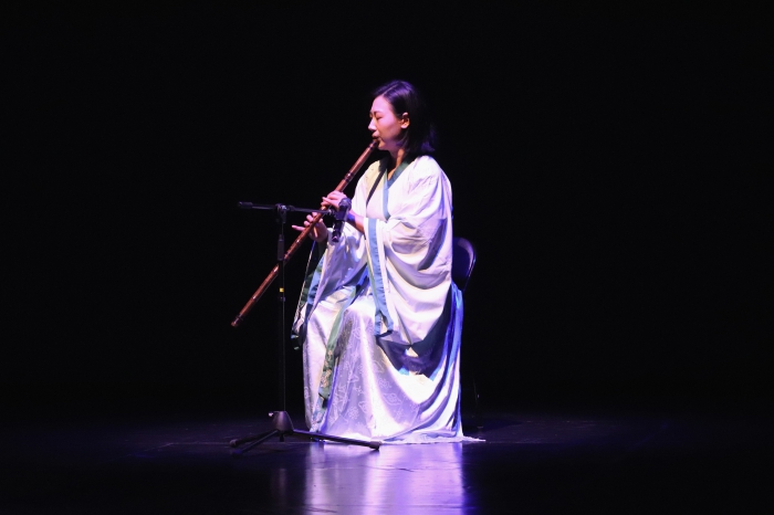 随后,在手碟演奏者许彤和箫演奏者孟姝彤现场演奏下,体验者们仿佛身处高山幽谷,在瑜伽教练冯轲的带领下正式开始了这场特殊的瑜伽体验。变换的灯光打造出宛如幻境的舞台效果,轻柔空灵的音乐萦绕耳畔,学员们跟随教练完成着各种体式的练习,全身心的投入到这场多重艺术体验的瑜伽健身活动中。