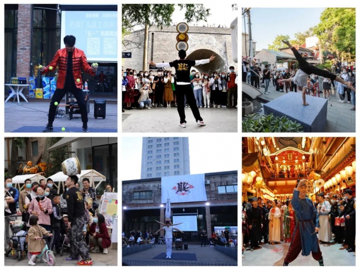 疫情反复,防控限流成为常态化,文旅行业陷入前所未有的困境......困难摆在眼前,机遇也在眼前。西安演艺集团战士战旗杂技团的管理者和文艺工作者们从当下出发,坚定信心,因地制宜,用实际行动迈出了一条复杂形势下文艺院团转型发展之路的第一步。 “下沉”基层 艺术回归市井 这个五一,许多市民响应周边游、近郊游的号召,没有选择长途游览,而是携老扶幼走上街头,感受自己日夜生活着的这千年古都的初夏。西演战士战旗杂技团的演职人员们创新演出模式,三地联动,在位于东二环外老钢厂设计创意产业园和建国门城墙根的老菜场市井文化创业街区,以及曲江新区曼蒂广场的长安十二时辰主题街区里,开展惠民演出活动。各具特色的市井街头,演员们一丝不苟,表演着各自的技艺绝活,引来众多市民游客驻足观看,并迅速在自媒体平台发酵,促使三地人气不断聚集,游客流量显著增长,形成了显著的文旅融合作用。而“战士战旗”这个一直“深在闺中人未识”的文艺院团也随即在西安本地火出了圈,许多市民观众和网友惊呼“原来那个只能在屏幕上看到的杂技天团就在我们身边”。