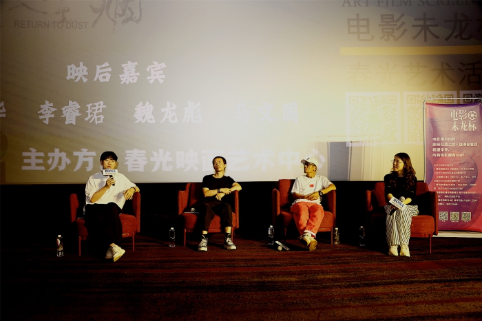 《隐入尘烟》导演李睿珺 米浩/摄 本次活动由春光映画艺术中心主办,也是其主办的第155场艺术放映活动。在映后交流中,几位嘉宾首先就影片及自身感受进行了现场分享:马文国认为影片以朴素的形式揭示了生命的一种真实,虽然很艰难苦涩,但是生命中依然有欢乐,依然有光泽。南华表示,影片承载了最底层人的生之维艰,既是痛苦的,又是执着的,在痛苦中又催生出幸福的主题。不仅如此,作品从生之维艰的观念上升到人的尊严。导演以尊重、平视的方式,真正把具有根性、血脉性的人群、对这个现代性的感受讲出来。魏龙彪从故事本身、创作环境的艰难,以及对边缘群体的尊重三方面表明了影片的可贵。