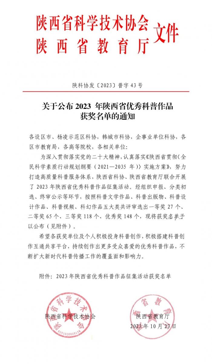 文化艺术网-文化艺术报讯(全媒体记者 何超锋 )日前,陕西省科学技术协会、陕西省教育厅联合发布《关于公布2023年陕西省优秀科普作品获奖名单的通知》,由陕西美图文化传播有限公司摄制出品、惠焕章编剧导演的纪录片《走近中医》获得科普视频类一等奖。