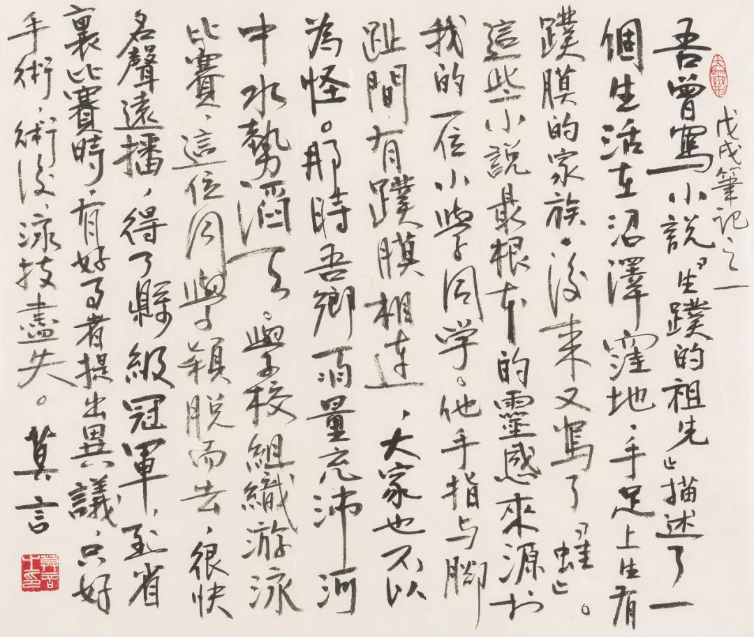 莫言写毛笔字有十几年了,但他总是不好意思称自己的作品是“书法”。朋友劝他,顶多练好20个字,要么是厚德载物,要么是宁静致远,要么是志在千里。出去题字就题这几个字,一是避免写错别字,二是避免写的难看,被别人笑话。